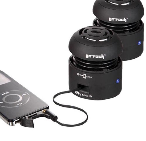 The Go Rock TRMS02S mobile speakers are small in size but big in audio performance and style. These palm size portable speakers use a patented rectractable cable making them ideal for listening to your music on the move! The two mini speakers magnetically fasten together for convenient and easy transport. Each speaker twists open to provide extra rensonant bass. The built-in lithium batteries are fully rechargeable via USB and provide about six hours of playing time. The Go-Rock speakers are equipped with a standard 3.5mm audio interface making them perfect for MP3 players, smartphones, netbooks, laptops, tablets, and desktop computers.