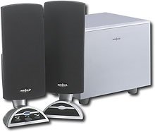 This three-piece speaker system amplifies computer and MP3 player output so you can share the sound with others. The 10-watt subwoofer adds full bass to your place. 14 watts total output speaker power (satellite speakers: 2 watts x 2; subwoofer: 10 watts) Works with computers, video game consoles, MP3 players, DVD players, CD players and other peripheral devices Acoustically balanced wooden subwoofer cabinet